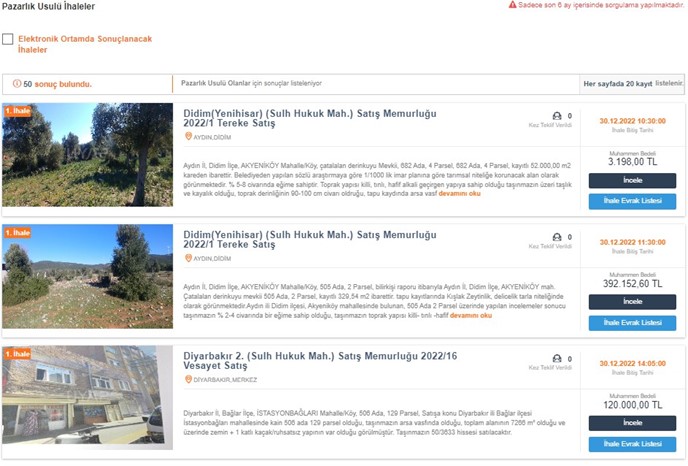 Bu sorgulama işlemlerinde il ya da alt kategori seçimi zorunludur. Seçilen özelliklere göre yapılan sorgulama sonrası artırma süresinin bitimine 30 gün kalmış ihaleler gösterilmektedir.